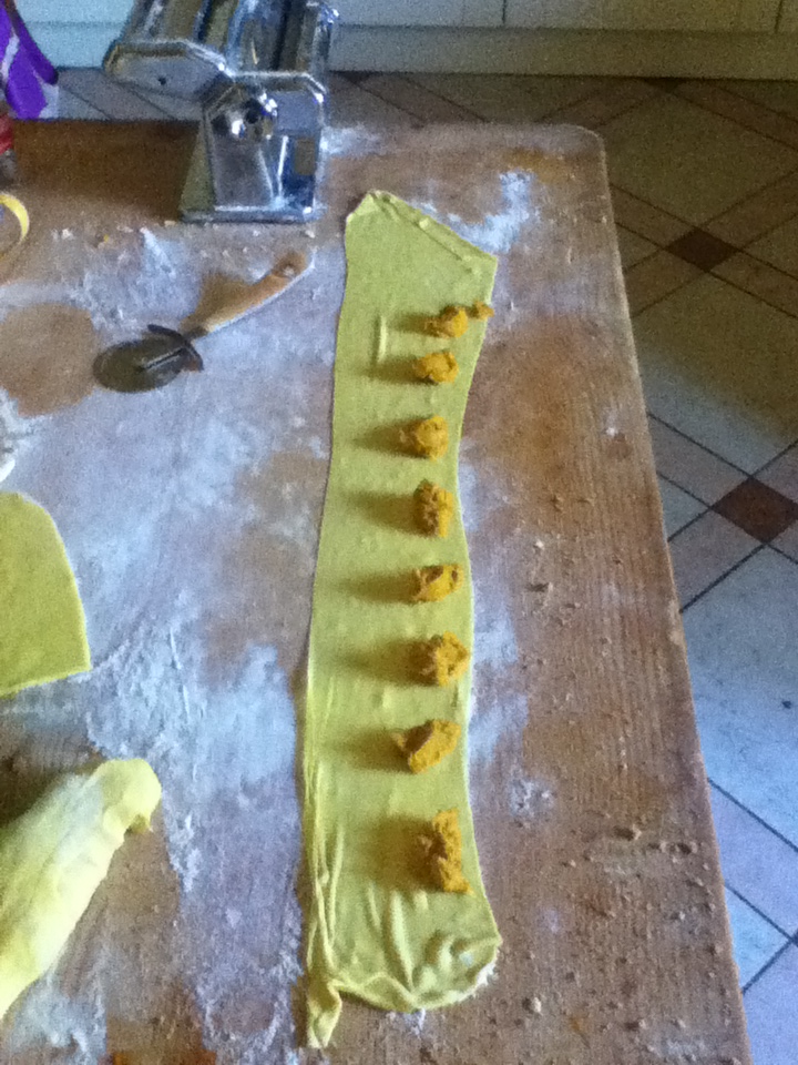 Prendete la vostra palla di pasta, ricavatene una pallina più piccola, schiacciatela e passatela nella macchina per la pasta fino all'ultimo scatto (ovvero il più sottile possibile) in modo da avere delle lunghe striscie sottili di pasta. Disponete una noce di ripieno con l'aiuto di un cucchiaio ed un coltello ad una ditanza di 2 cm l'una dall'altra e richiudete su sé stessa la striscia di pasta. Schiacciate con le dita intorno al ripieno in modo che la pasta si “incolli” bene e tagliate dei rettangolini (io li ho lasciati così ma in realtà potete anche stringerli ovvero unire i due angoli del lato superiore).